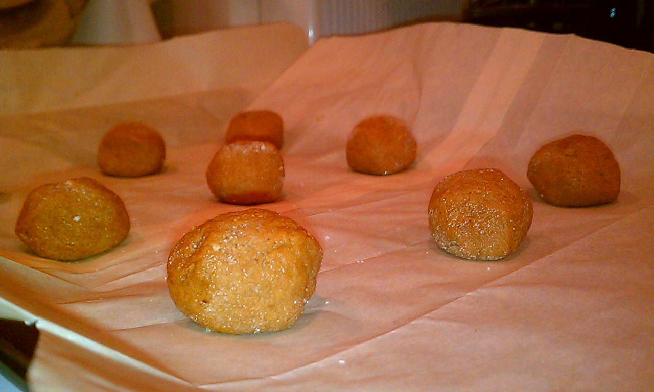 Roll the dough into 3/4-inch balls, then roll each ball in the sugar until lightly coated. Transfer to parchment lined cookie sheets, leaving 1-inch of space between the cookies.