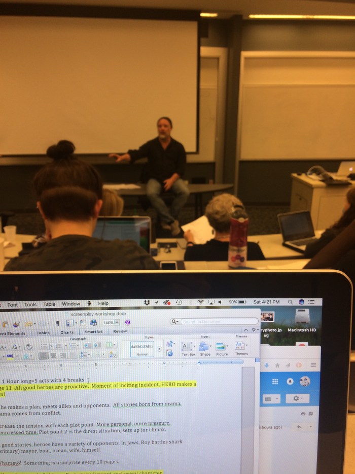 November 4, 2017 by kimicalreaction Screening Room ~Thankful for the chance to take a screenplay writing workshop with Michael Lucker, hopefully opening doors for new writing opportunities!~ Share this: Click to share on LinkedIn (Opens in new window) LinkedIn Click to share on Pinterest (Opens in new window) Pinterest Click to share on Facebook (Opens in new window) Facebook Click to email a link to a friend (Opens in new window) Email Click to share on X (Opens in new window) X Click to print (Opens in new window) Print More Click to share on Reddit (Opens in new window) Reddit Like Loading... Related