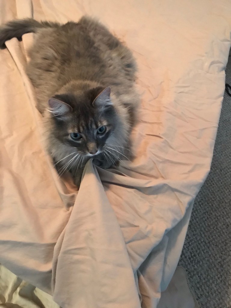 “That’s it, you furry little bastard.” I snarled. “It’s seriously sleepy time now. No more of that.” I snatched him up and dumped him on the foot of the bed.