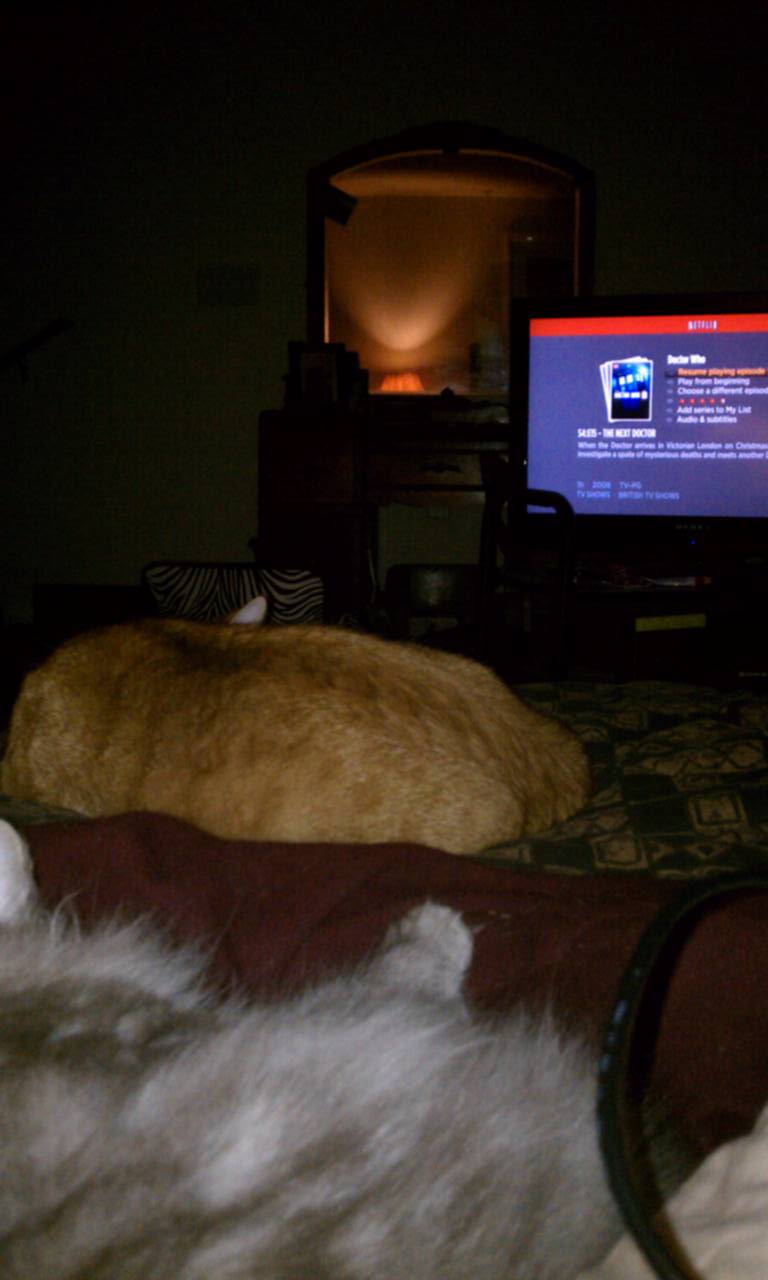 Right now, I’m curled up in bed, cushioned by cats, writing on my laptop and chain-watching Dr. Who episodes.